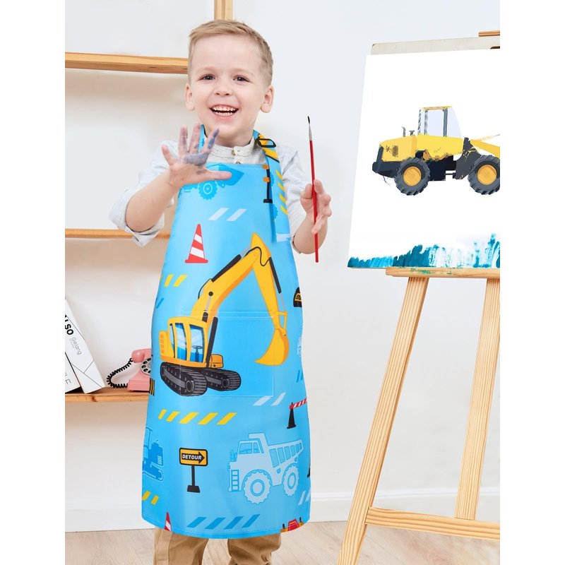 - 【COMFORTABLE FABRIC】The excavator toddler apron is made of waterproof nontoxic polyester, lightweight and durable. Skin-friendly and breathable fabric is a good choice for your children. Easy to clean, machine wash or hand wash and air dry.