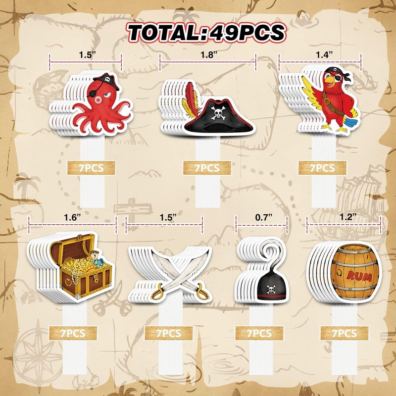 - PACKAGE INCLUDED - 49 PCS pirate theme party cake supplies, including 7 patterns( pirate, pirate hat, octopus, iron hook, double knife, Rum, jewelry box ), 7 of each.