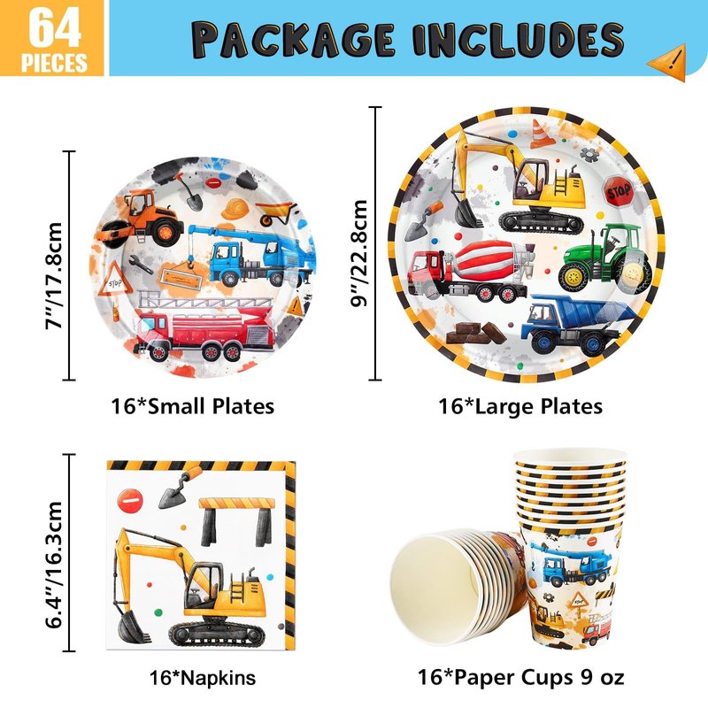 - PACKAGE & SIZE - The construction party supplies includes 64 pcs party supplies: 16 * paper cups, 16 * 7’’ and 16 * 9’’ plates, 16 * 13’’ x 13’’ napkins. A complete combination of the party tableware kit. Enough for kid’s dinner dessert party and outdoor picnics.