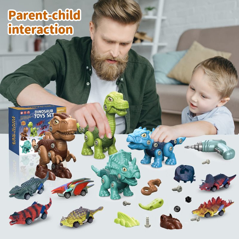 - Super Value: This dinosaur building toy set include 4 take apart dinosaur figures: brown tyrannosaurus rex, teal triceratops, blue stegosaurus, and yellow green brachiosaurus; 6 pull back dinosaur cars. 1 battery operated electric drill; plastic screw drivers for assembling/disassembling the dinosaurs. The dinosaur toy set features cool and colorful design, easy to assemble and disassemble; perfect for stem education, and it will definitely bring endless fun for your kids.