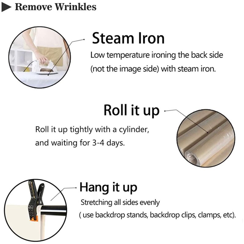 In Order To Facilitate Transport and Packaging,the Backdrop Will Be Folded To Send.If Wrinkles Exist,you Can Smooth Out The Wrinkles By The Following Method. 1.Roll It Up Tightly with A Cylinder, and Waiting for One Night or Longer To Remove Crease. 2.Can Use A Steam Iron,gently Ironing The Back Side (not The Image Side) with Low Temperture To Remove The Wrinkle.To Avoid Possible Steam Damage,place A Layer of Dry Cloth Between The Backdrop and The Iron.And Do Not Iron The Same Place Too Long To Prevent From The Material Damage.