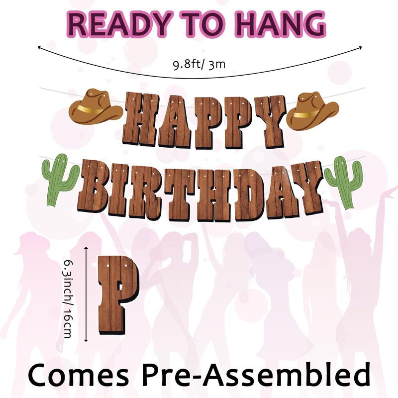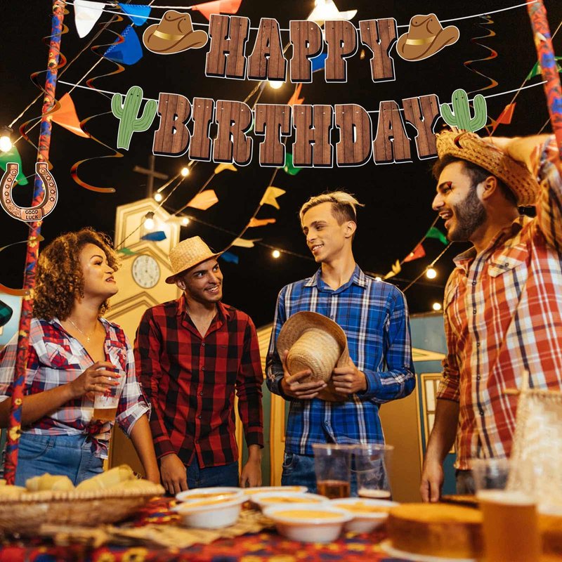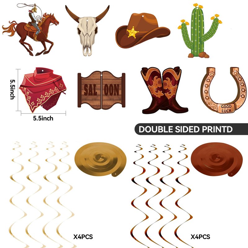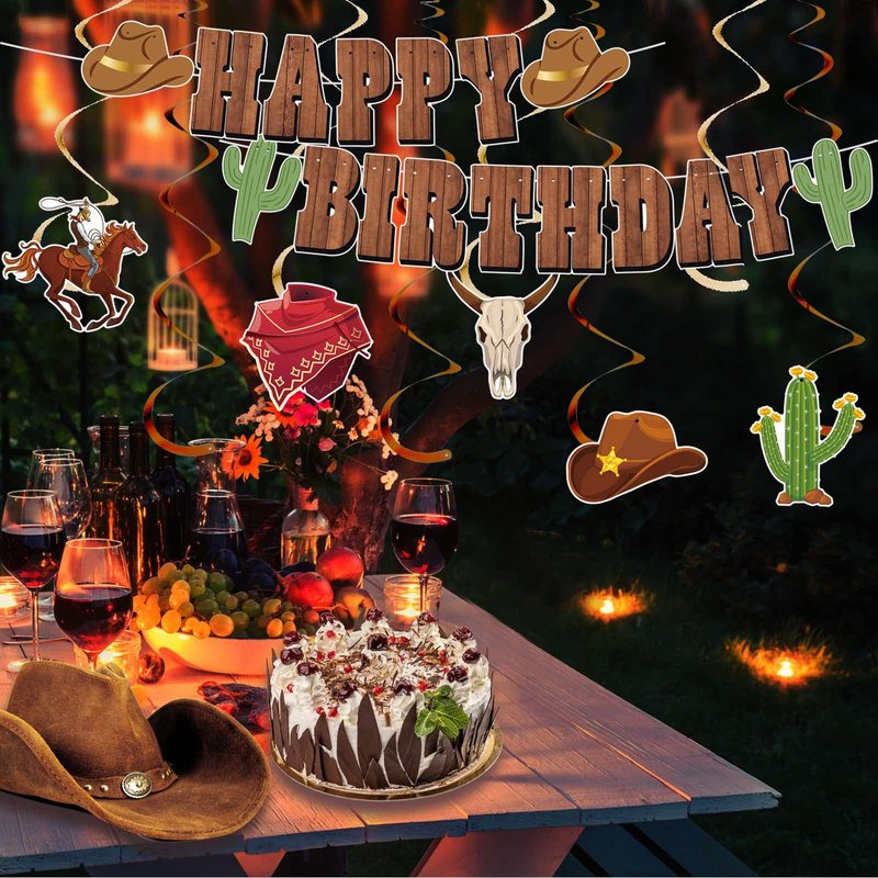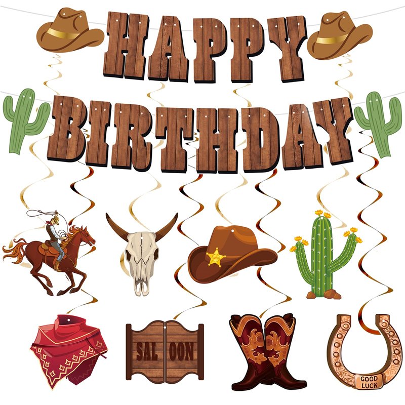 - Cowboy-Themed Party Decoration Set This set includes 1 Pre-Strung "Happy Birthday" banner, 12 cowboy cut-out decorations, and 12 Hanging Swirls, perfect for creating a western birthday party atmosphere with fun cowboy theme party decorations and Wild West charm.