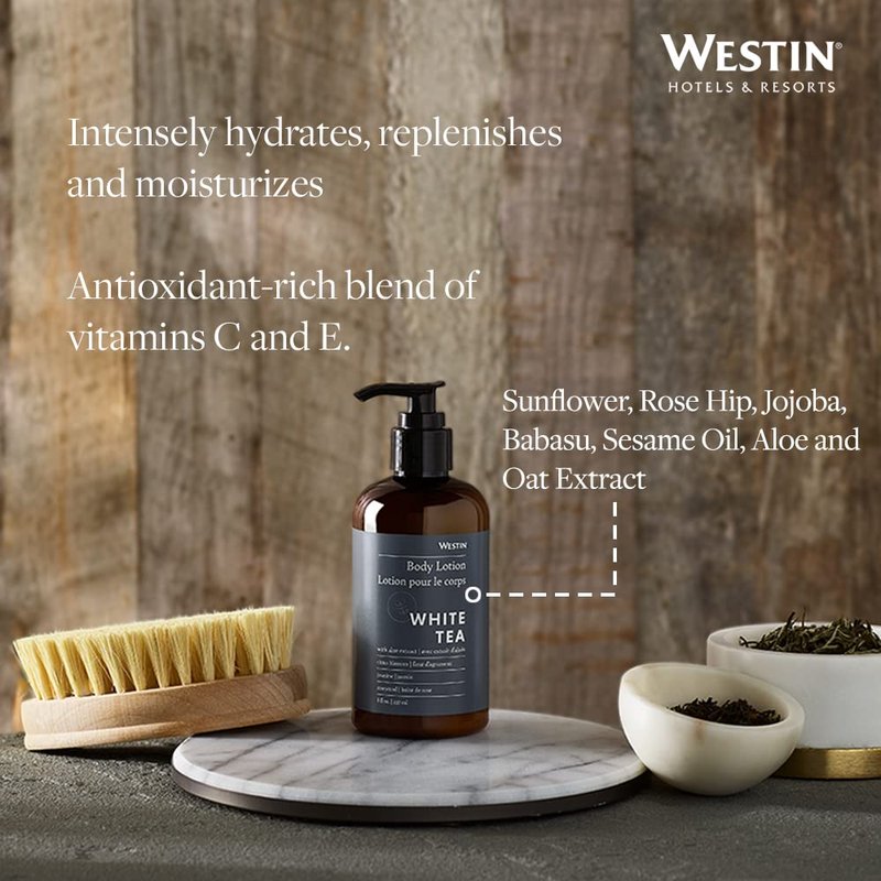 Bring the Westin Hotel bath and body experience into your home with the signature Westin White Tea Scent. Westin White Tea Body Lotion is fortified with vitamins, white tea antioxidants, and other minerals and natural botanicals to replenish skin. Restorative, moisturizing ingredients like shea butter, aloe, oat extract, jojoba, rose hip, and more deeply nourish and condition skin for a healthy, radiant, all-over glow. Our unique, non-greasy formula absorbs quickly to leave your skin looking and feeling smooth and healthy!
