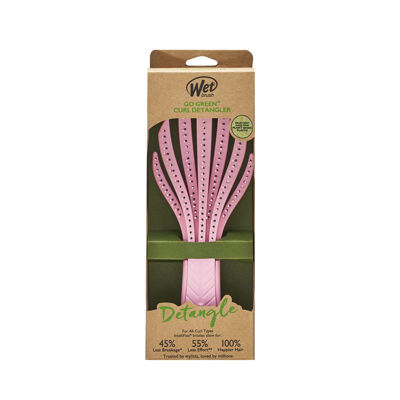 - Curl Detangler: Specifically designed for curly hair, the unique shape and finger-like prongs on the Wet Brush Go Green Curl Detangler bend and flex to adjust to your curl type to prevent tugging and pulling. Brush body made with 56% plant-based plastic.