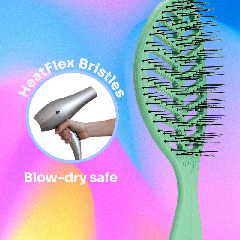 - Speed Dry: The Wet Brush Go Green Speed Dry gently loosens knots while blow-drying without pulling or snagging. This vented hair brush helps hair stay strong and healthy. Brush body made with 58% plant-based plastic.