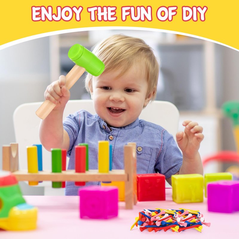 Features: Safety first: Safety is important, which is why this set is made from reliable materials. The smooth edges and friendly designs of hammering pounding toys ensure that it is safe for use, providing you with peace of mind. Nice gifts: The wooden peg and hammer make for ideal gifts for birthdays, holidays, or some special occasions. They not only provide entertainment but also promote the development of vital skills. Specifications: Material: Hammers: wood and plastic Nails: wood Color: as the pictures shown Size: Hammers: about 6.5 inches / 16.5 cm Nails: about 2.1 inches / 5.4 cm Package includes: 10 x Wood hammers 100 x Wooden nails Notes: Manual measurement, please allow slight errors on size. The color may exist a slight difference due to different screen displays. Little ones should use our product under the supervision of adults. Small items are included, please keep them away from little ones in case of choking risk.