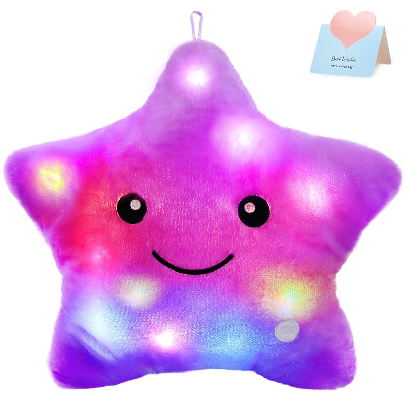 - This is a good plush pillow to show your kids that what is a star and how to shine. This pillow has one push-button, when you press it, it can light. During the process, the light will change colour, and you can turn it off anytime if you press the same button again. If you forget to turn it off, the cute star will turn off in 30 minutes automatically. NOTICE: Don’t clean it in the water as it is installed LED light. It takes 3 AA batteries, but the batteries are not included.