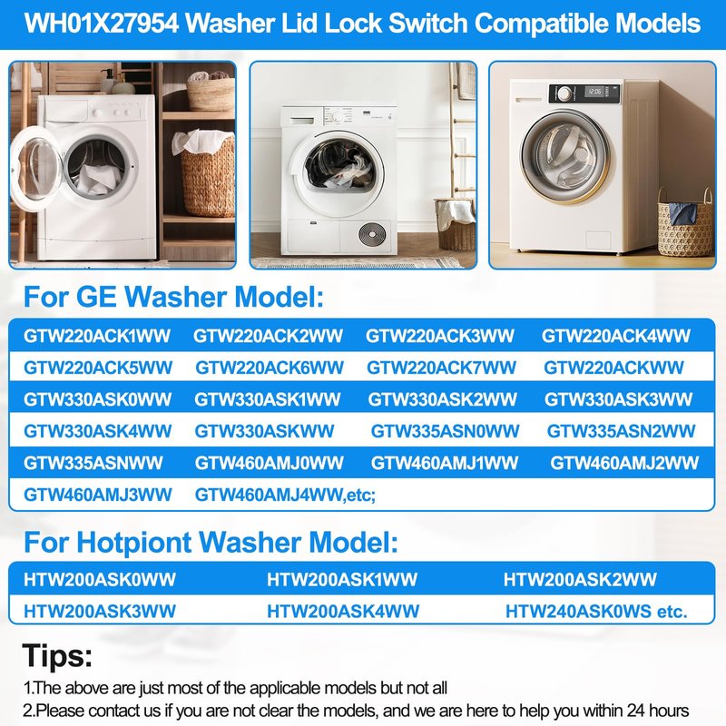 - ✅【WH01X27954 Washer Lid Lock Switch Replacements Compatible Models】Our WH01X27954 washer door lid lock switch fits for GE and Hotpoint washer washing machine,for GE washer model: GTW220ACK1WW, GTW220ACK2WW, GTW220ACK3WW, GTW220ACK4WW, GTW220ACK5WW, GTW330ASK1WW, GTW330ASK2WW, GTW335ASN1WW, GTW335ASNWW, GTW460ASJ6WW, GTW485ASJ2WS etc;for Hotpiont washer model:HTW200ASK0WW, HTW200ASK1WW, HTW200ASK2WW, HTW200ASK3WW, HTW200ASK4WW, HTW240ASK0WS etc.(Please contact us if you are not clear the models,