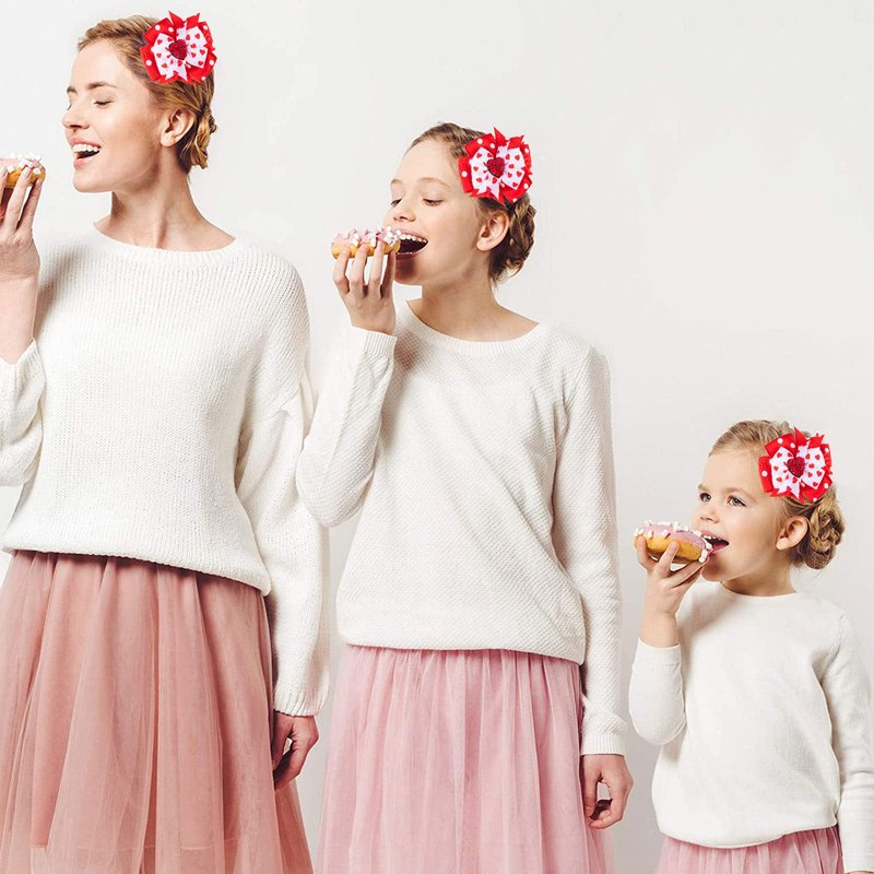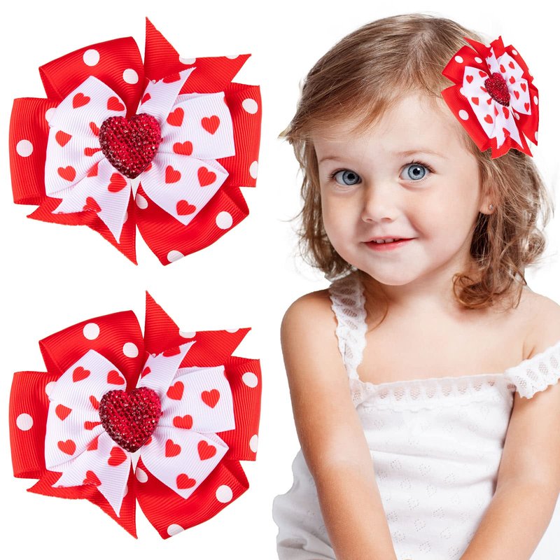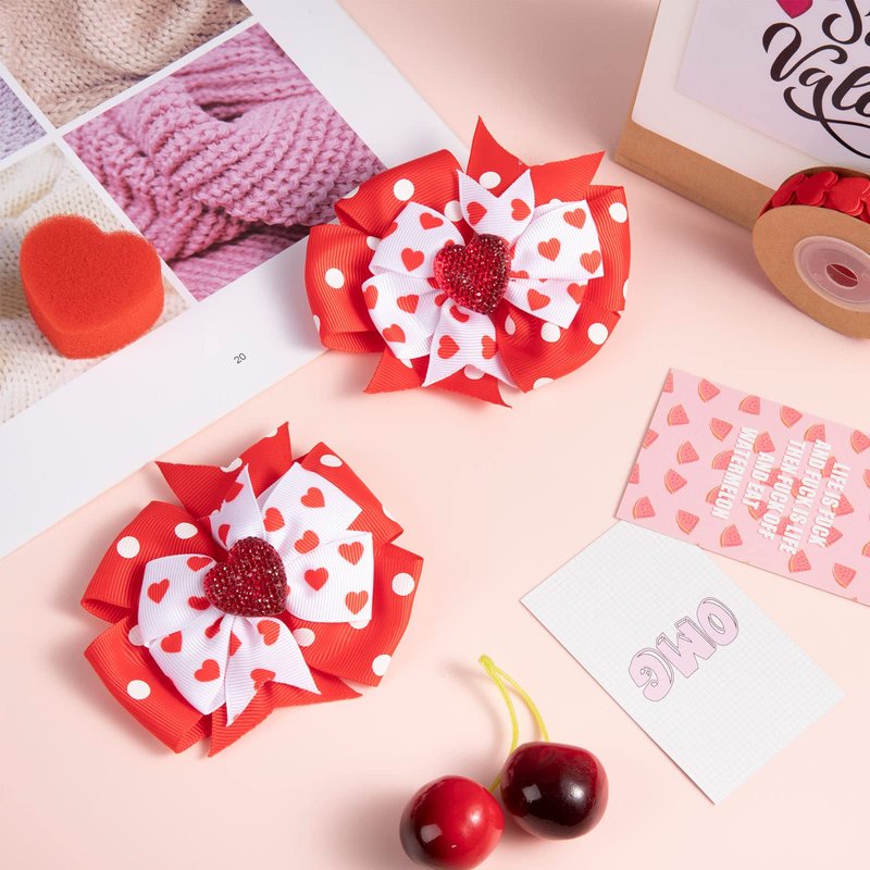 2 pack bow hair clips in bright red and white, patterned with hearts and dots, smooth and soft to touch, comfortable to wear, great hair accessories for daily and party use.