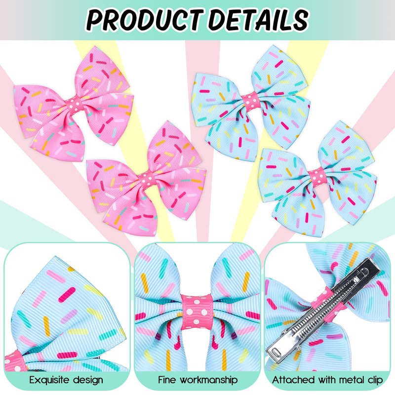 - Package Includes - 4pcs ice cream sprinkles hair bow clips in pink and cyan color, sufficient for you to spare or replacement, meeting your different holiday dressing needs.