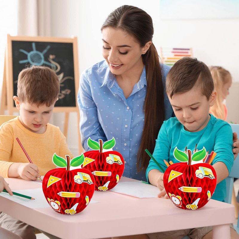 - Unique Design - The honeycomb is shaped with apple in red color, the decorative stickers patterned with classic elements such as school bus, pencil, ruler, clock, etc., each one can stand on the table firmly, wonderful school table toppers.