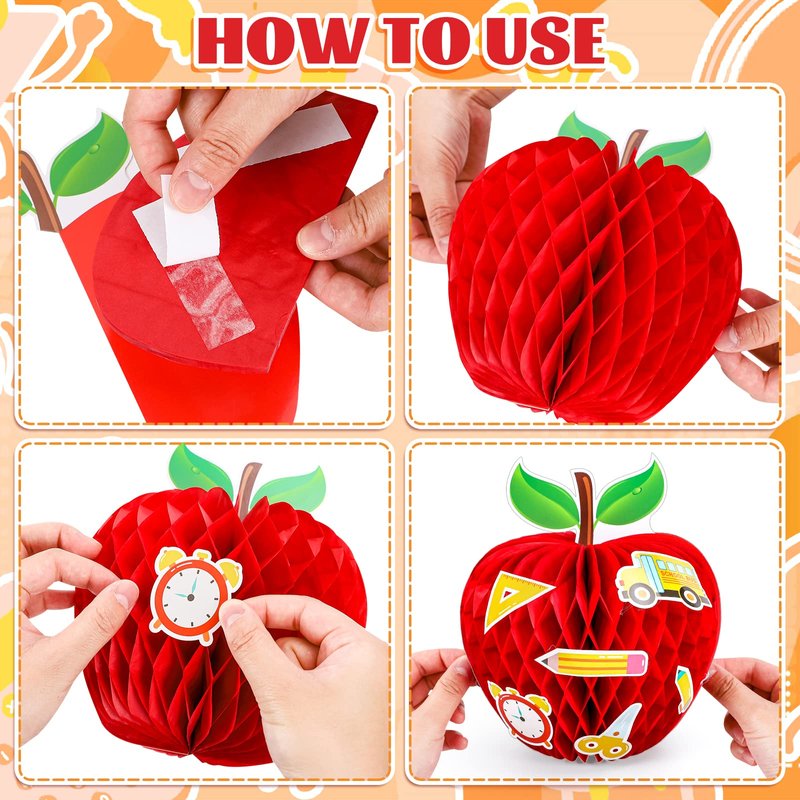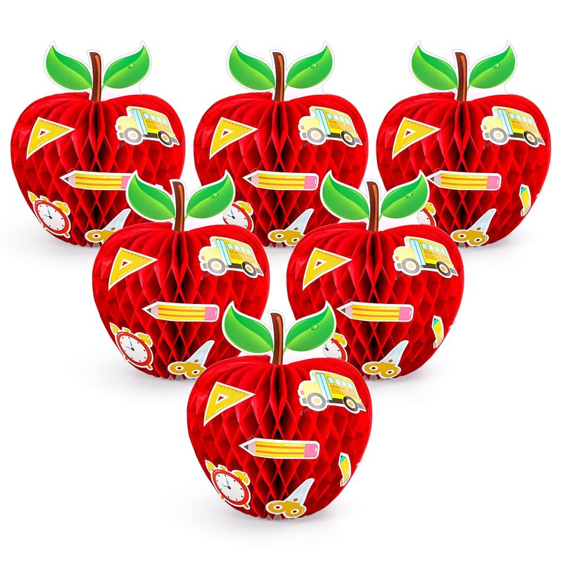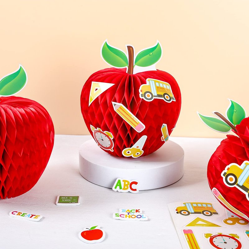 6pcs back to school theme honeycomb centerpieces are designed in red apple shape and matched with cute stickers, which makes your party look more exquisite.