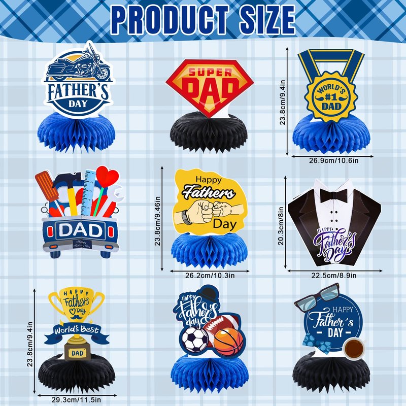 - Unique Design - The honeycomb is colored in black and blue, patterned with classic elements such as tool cart, suit, trophy and printed with the word of Happy Father’s Day and Super Dad, each one can stand on the table firmly, wonderful holiday table toppers.