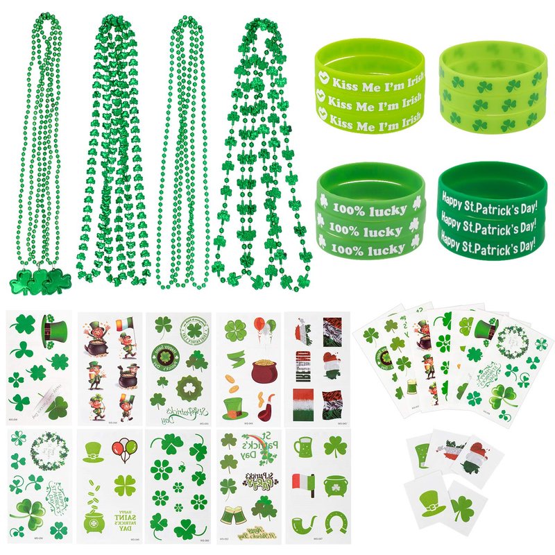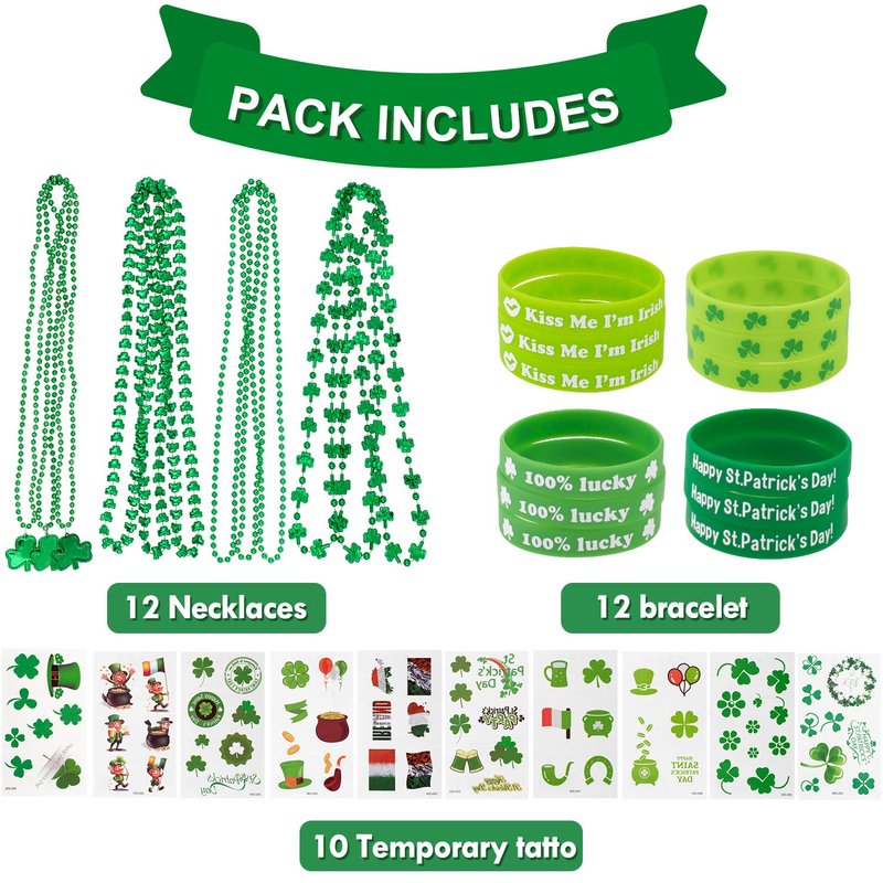 - St Patrick's Day accessory set – Comes with 94 pieces in total, 10 sheets St. Patrick's Day temporary tattoos, 12 pieces St. Patrick s green shamrock necklaces, 12 pieces rubber wristbands bracelets, a great Ireland day green accessories party gifts