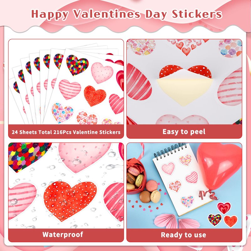 WhatSign Valentines Day Stickers 216Pcs Valentine Stickers for Kids Valentines Day Heart Stickers Valentines Party Decorations Stickers Gifts for Kids Classroom Crafts Birthday Valentines Party Favors