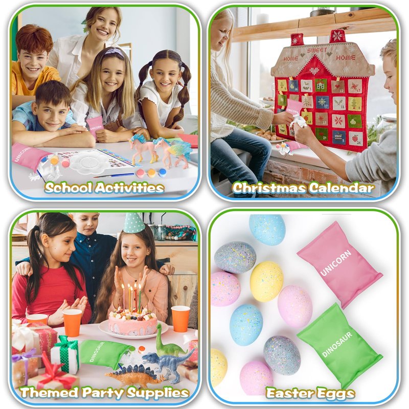 These party craft kits for kids include 8 individual bags, each including 1 unicorn figure to paint, 1 set of 3 pastel paints, and 1 brushes. Ideal as party favors for kids and pinata filler.