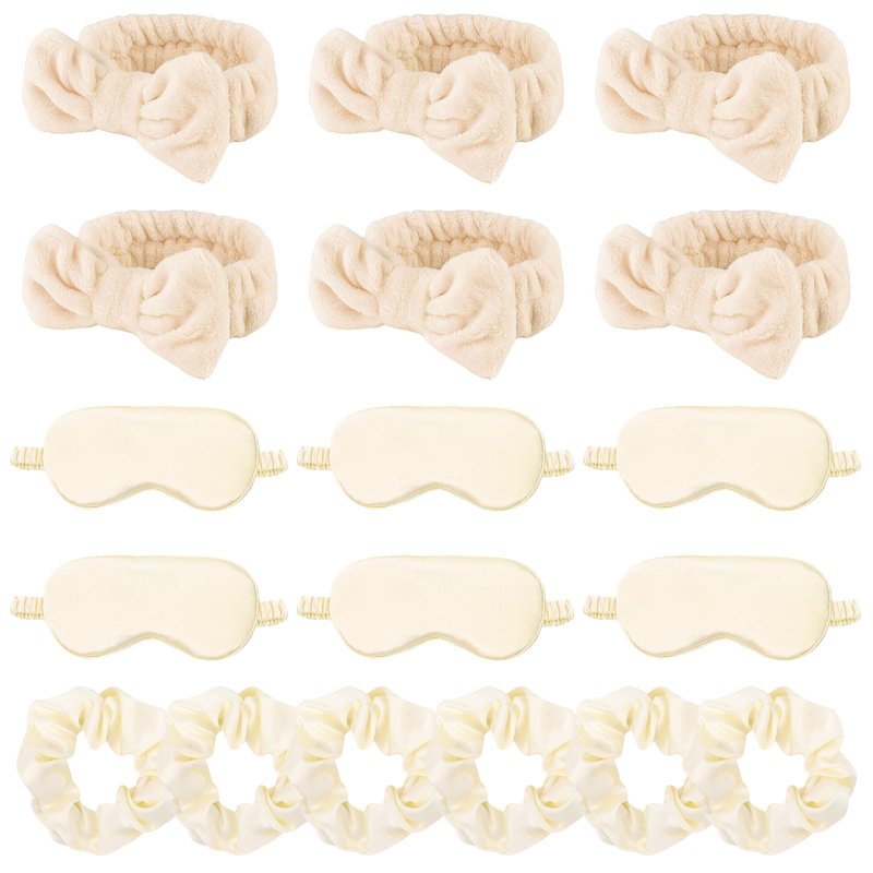WHAVEL 18 Pcs Sleepover Party Supplies for Girls - Party Favors Include 6 Spa Headband, 6 Silk Eye Mask and 6 Stain Scrunchies for Spa Birthday, Bachelorette Party, Slumber Wedding (Khaki)