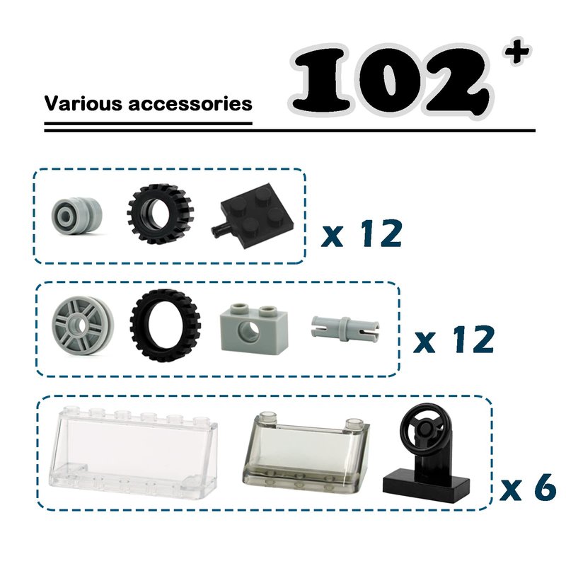 - 【102 PIECES】 Include Steering wheels, windshields, chassis, tires, wheels and axles pieces. Some parts require assembling.