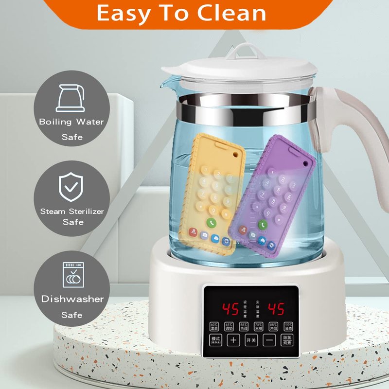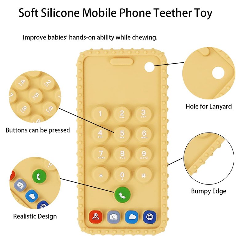 - 1. Our Soft Silicone babys teether toy contains a teething toy in the shape of Mobile Phone and a anti-dropping pacifier clip.Recommended to use boiling water or steam to clean the teething toy 5 minutes for the first time. can be refrigerated and heat-sterilized from -40°C to 240°C.