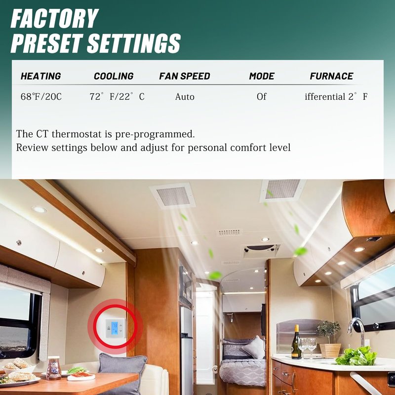 - Replacement KUTTOLE RV Thermostats: The RV Single Zone Wall Thermostat Relay Box using the advanced technology of capacities sensors instead of physical buttons, allows you to feel the RV is literally at your fingertips with the CT Thermostat. Gently tapping on the input areas of the control allows you to access all the climate control features, and when you touch any input the display lights up so you can see the temperature, mode, and points with ease.