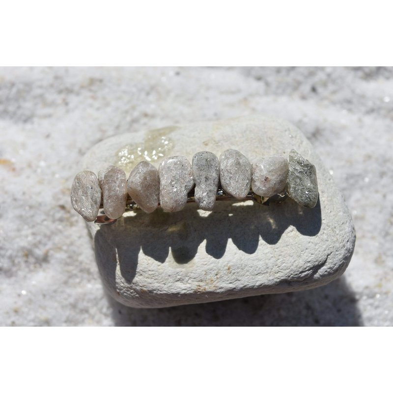 Pretty white aventurine stone french barrette, the stones have a gorgeous coloring. The stone french barrettes adorned with white aventurine stones. The white aventurine stone hair clip is the perfect accessory for a night out, and can dress up an outfit or be used for a special event, like a quinceanera, first communion, or even a wedding. The hair clip is hand made in the USA and come from a smoke free environment. The white aventurine stone hair clip measure: 61 mm x 16 mm x 15 mm or 2.4 inches x .6 inches x .57 inches.