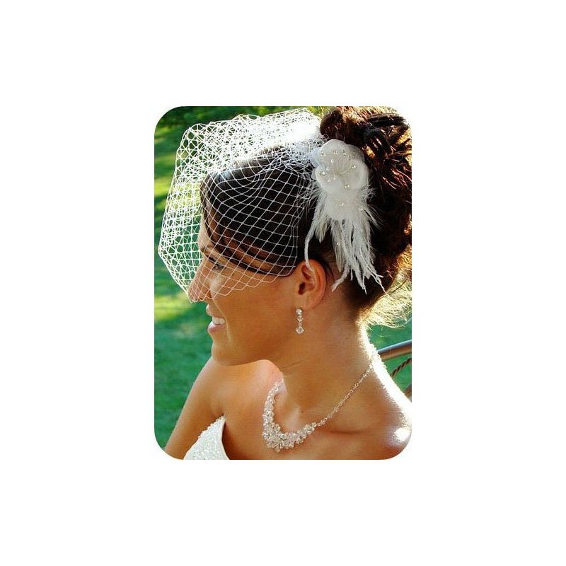 White Birdcage Veil & Flower Feather Fascinator Comb