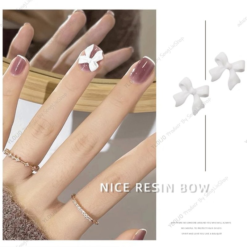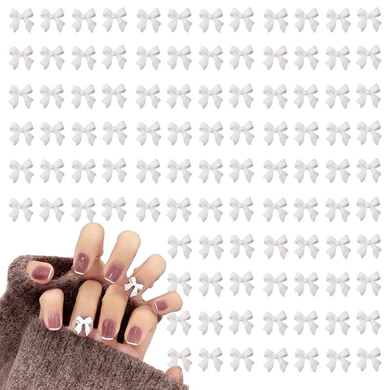 - White Bow Nail Charm for Women Girl, 100Pcs 3D Nail Decoration Resin Bow Nail Rhinestones Bowknot for DIY Nail Art Accessories
