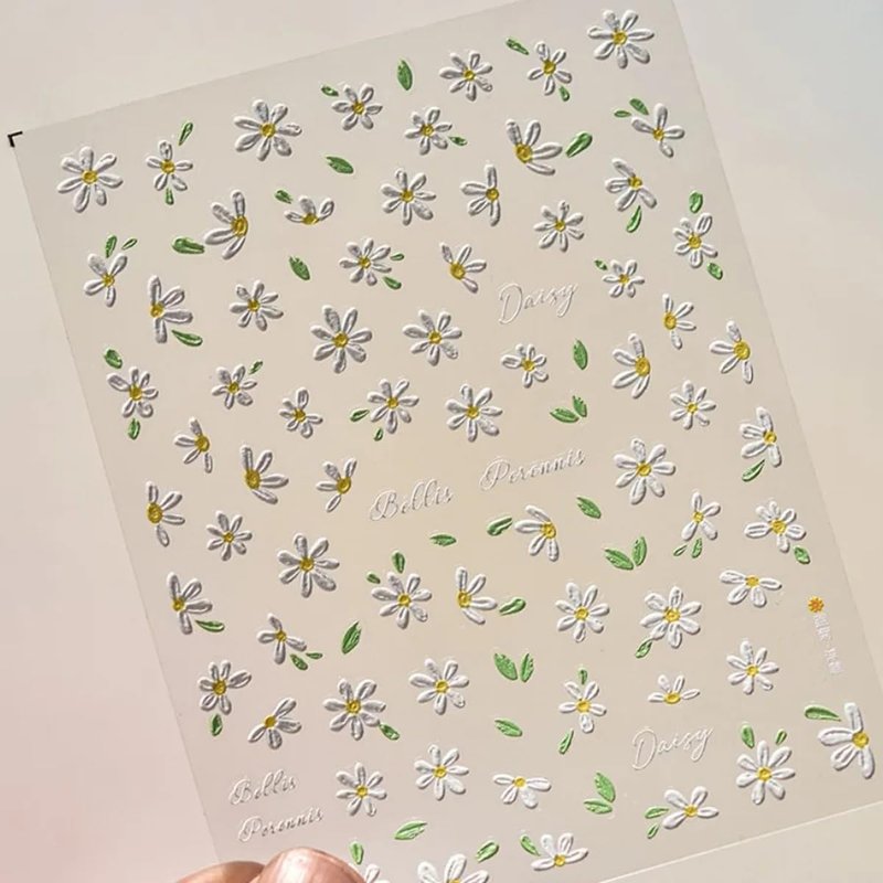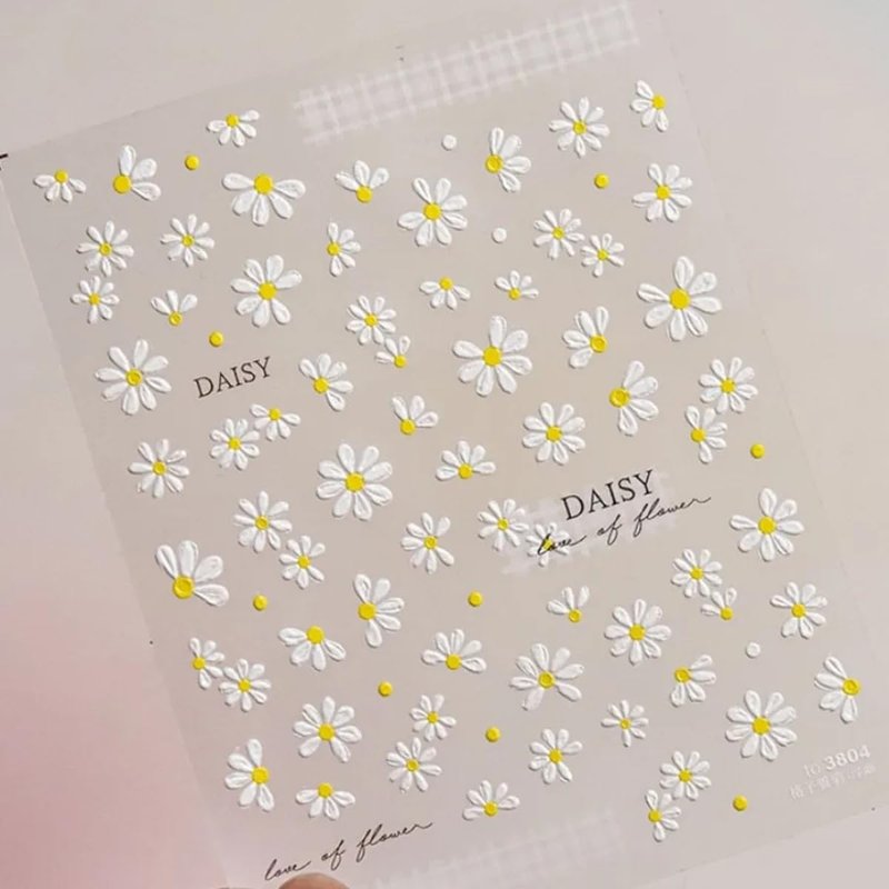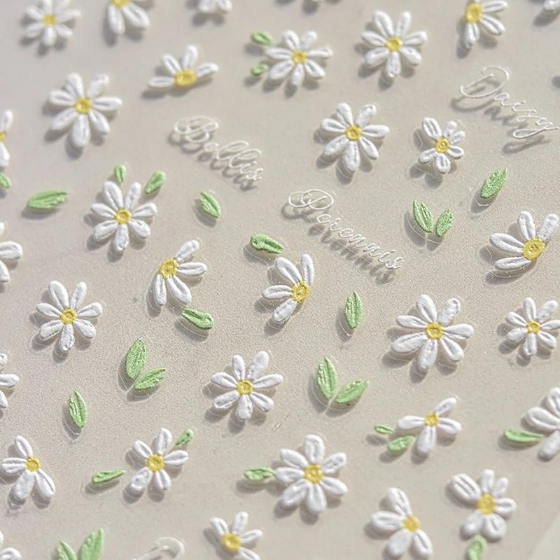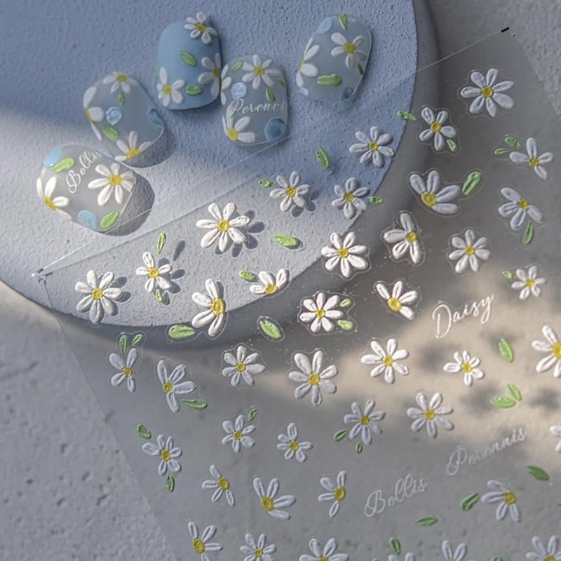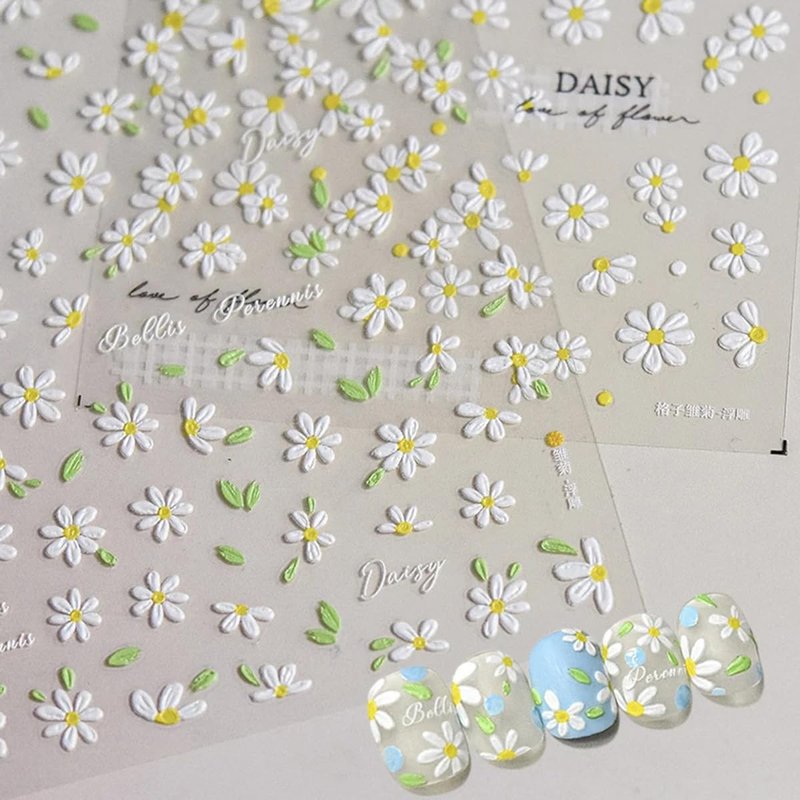 - Daisy Nail Art Decals: 2 sheets of 5D embossing carving patterns daisy nail stickers give people an intuitive and advanced exquisite feeling. Floral daisy elements spring nail decals are perfect for decorations for your spring nails.