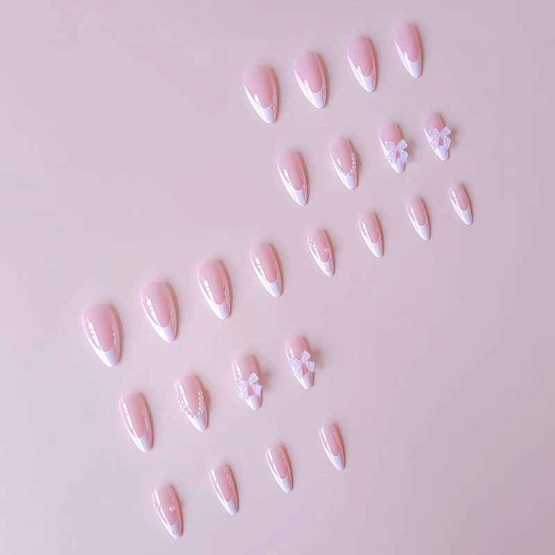 White French Tip Press on Nails Almond - WLGDLH Pink Fake Nails Short French Pearls False Nails Cute Bow Nail Charms Designs Nail Tips Acrylic Full Cover Glue on Nails for Women Girls 24 Pcs