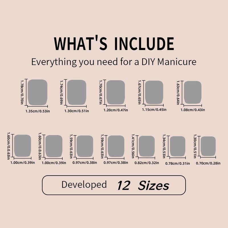 - 【Package & DIY Nails】You'll get 24 false nails in 12 sizes. 1 mini nail file, 1 small wooden stick, 1 piece of adhesive tab glue. You can safely choose a fake nail that fits your finger size and DIY your desired nail shape.