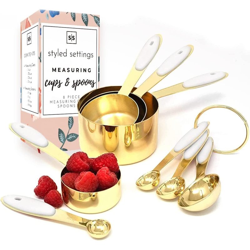 WHY BUY STYLED SETTINGS GOLD MEASURING CUPS AND SPOONS SET? We are a small, family-owned business, selling modern American designed high-end, quality food safe products. We take great pride in making sure your order is handled with care. If you ever have any questions or special requirements, let us know what you need and we'll make things right. COMPLIMENT YOUR PASSION FOR STYLE WITH RADIANT TOOLS IN YOUR KITCHEN Life is better with fresh baked cookies, on trend with gold measuring cups and spoons set made with resilient stainless steel are perfected in a radiant gold so you can show that dough who is boss. Part of our exclusive Kitchen to Table collection, designed by Styled Settings Gold measuring cups and gold measuring spoons each conveniently attach on a ring for easy access, great for hanging or easy stacking ability for efficient storage Made of sturdy stainless steel, with titanium coating - both top choices for food safety and durability in professional kitchens Hand wash and dry to maintain brilliance and beauty. PRECISE MEASUREMENT MARKINGS WILL NOT FADE The Styled Settings 8 piece kitchen measuring cups and spoons set consists of the following: ✔ 4 measuring cups- 1/4 cup, 1/2 cup, 1/3 cup and 1 cup ✔ 4 measuring spoons- 1/4 tsp, 1/2 tsp, 1 tsp and 1 tbsp QUALITY MATERIALS AND CRAFTSMANSHIP - Made of titanium-coated stainless steel. No need to be concerned about the longevity of this set due to the meticulous craftsmanship. The combination of stainless steel and titanium ensure a long lasting, food safe product. These two materials are amongst the top leading materials used in professional kitchens and even hospitals due the quality and safety of the materials for the human body. SOPHISTICATED AND ON-TREND, GLAM UP YOUR KITCHEN ADVENTURES, CHOOSE THIS 8-PIECE STAINLESS STEEL MEASURING SPOONS AND CUP SET