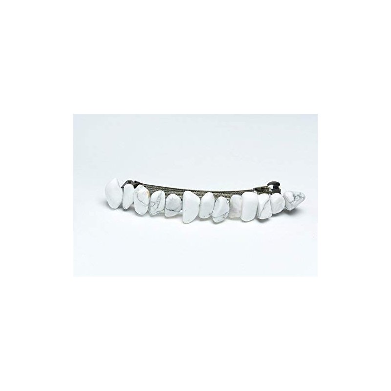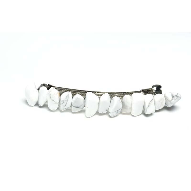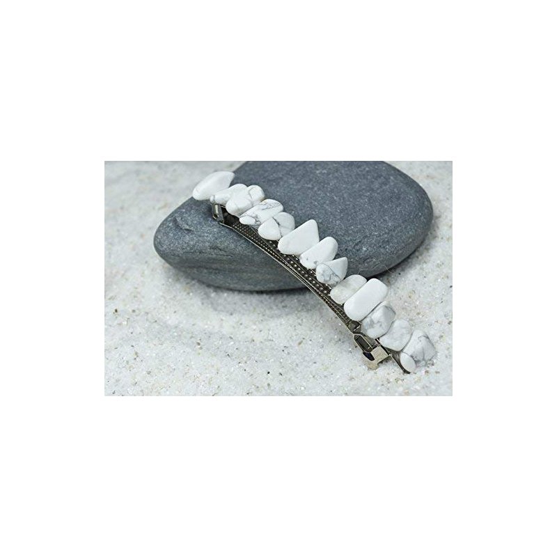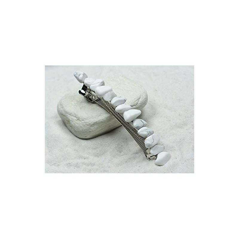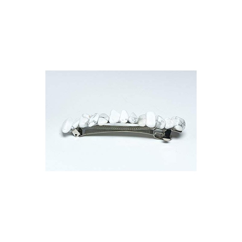 Pretty white howlite stone french barrette, the stones have a gorgeous coloring. The stone french barrettes are adorned with white howlite stones. The white howlite stone hair clip is the perfect accessory for a night out, and can dress up an outfit or be used for a special event, like a quinceanera, first communion, or even a wedding. The hair clip is hand made in the USA and come from a smoke free environment. The white howlite stone hair clip measure: 100 mm x 35 mm x 40 mm or 4 inches x .. 55 inches x .57 inches.