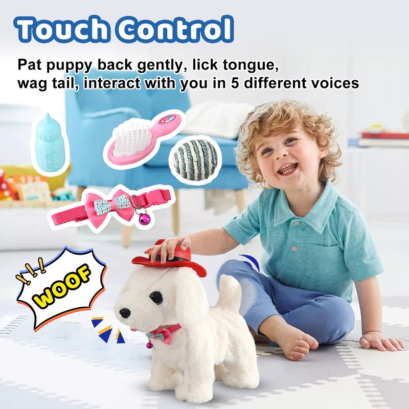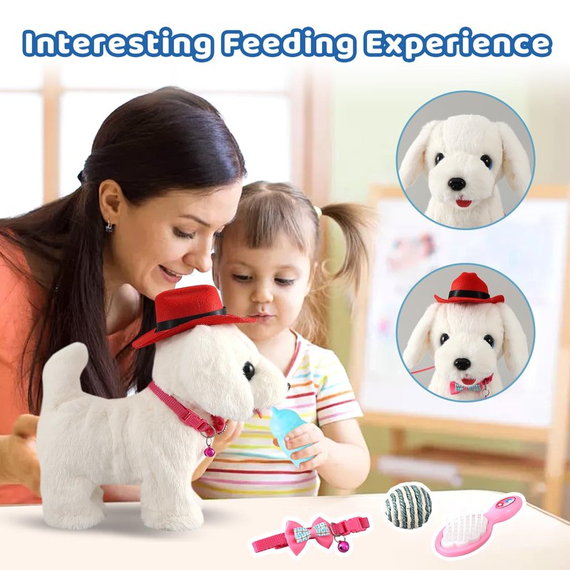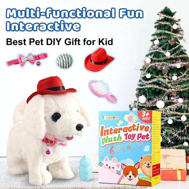- DIY Pet Toy Dog for Kid:Walking puppy toy set let child experience a different kind of fun and games. Grooming, DIY styling, feeding and playing with dog. Dog toys in a wonderful box with a dog and all accessories, pet toy ball, comb, bottle, hat, a bow tie collar.