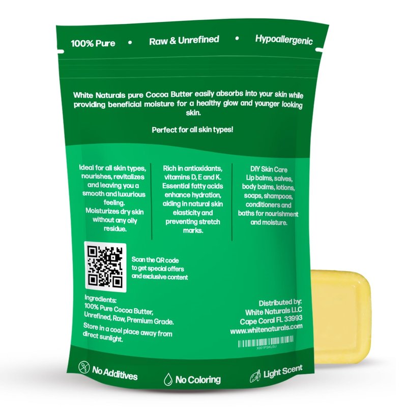 - Supportive for Skin Repair: Cocoa butter aids in repairing damaged skin by providing essential nutrients and promoting natural healing processes. By providing the skin with the nutrients it needs to regenerate and heal, White Naturals unrefined cocoa butter can help to improve the appearance of scars, blemishes, and other imperfections over time.