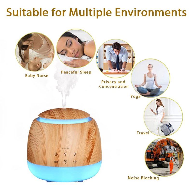 - 5-IN-1 MULTIFUNCTIONAL DEVICE: This is an premium aromatherapy device can be regard as a white noise machine or a essential oil diffuser. It features a large and easy to clean 300ml water tank, 7 different ambient color lights, 2 levels of warm night light,10 soothing sounds and timer setting for sound playback, waterless auto shut-off protection.