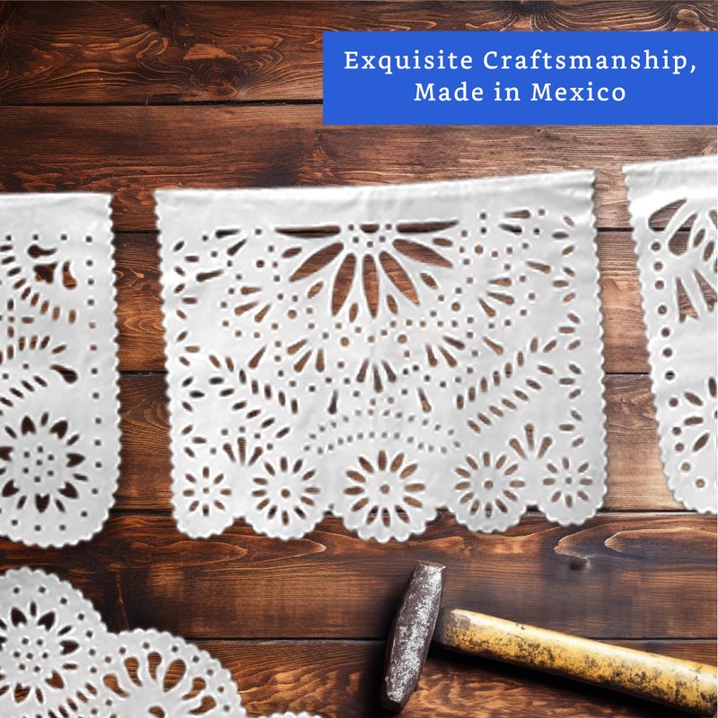 - Handcrafted by Skilled Artisans: Our white Mexican papel picado blanco are meticulously crafted by local artisans in Central Mexico who take pride in their work and heritage. Made from high-quality plastic Mexican cut outs, these banners are durable and will bring a unique and authentic touch to any party or celebration.