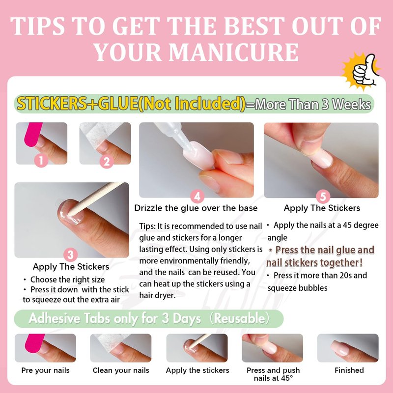 2.Please note that the nail glue is not included.If you want it last for a longer time,please use nail glue instead of the nail stickers.