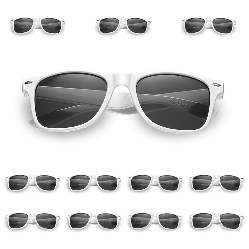 - BULK PACK-ONE SIZE FITS MOST: You get 12 White Retro Style Sunglasses In Each and Every Order-Great for party favors, graduation, wedding, bachelorette party, kids parties, the beach and outdoors. Each Pair Measures 5.5 Inches Wide and can fit Adults and Kids-One Size Fits Most.