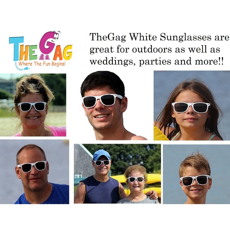 The Gags-Wholesale Lot-Party Pack-12 WHITE Plastic Retro Risky Business-Blues Brothers Black Sunglasses For Halloween Graduation-Mardi-Gras-Holidays-Birthdays-Parties-The Beach and Outdoor activity. One Size Fits Most Adults and Kids-UV 400 PROTECTION! Premium Quality Plastic and Lenses-Seeing Is Believing-When you use our White Retro Wayfarer Style Sunglasses, you can actually see out of them and use them everyday. Not only that but the plastic we use is also great quality. UV 400 Protection-WOW!-Our sunglasses come with UV 400 Protection, so feel great knowing your eyes are being protected when you use our White Retro 80's Style sunglasses. One Size Fits Most-Each Pair Measures 5.5 Inches Wide and can fit Children and Adults-One Size Fits Most. Bulk Pack-You get 12 White Blues Brothers -Risky Business Retro Style Sunglasses In Each and Every Order-Great for party favors, graduation, giveaways, kids parties, the beach and outdoors. Our Guarantee-If you don't agree that these are the Best White Retro Sunglasses with an unbelievable price for the Quality, please send them back for a refund with no hassle or questions asked. These will go great for Halloween costumes. Try using them with our Fake Mustaches or our Black Wayfarer Sunglasses both sold on Amazon. These may be cheap in price but they are NOT cheap quality.