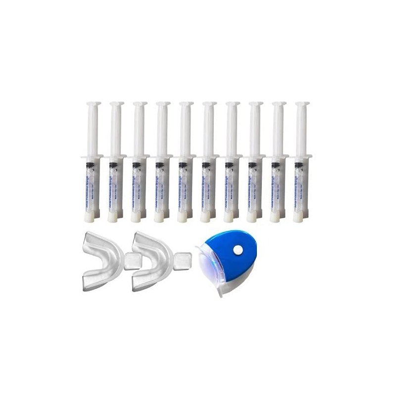 White Teeth Global Branded (TM) 35% Carbamide Peroxide 10 Syringes (10cc) Teeth Whitening Gel - (1) LED Accelerator Light - (2) Trays - (1) Mouth Tray Case - (1) Shade Guide - (1) Instructions Sheet