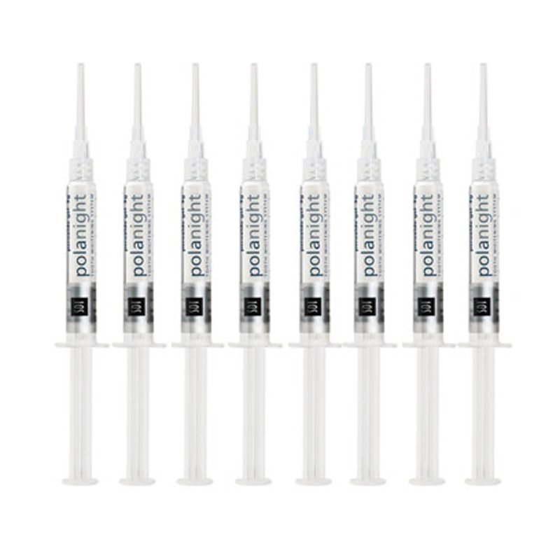 Pola Night 22% Carbamide Peroxide Teeth Whitening Gel. The high viscosity, neutral ph tooth whitening gels ensure the greatest comfort in a take home kit. The unique blend of soothers, conditioners and high water content assist in reducing sensitivity. The formation of plaque and tooth decay is significantly reduced. Contains 8 syringes from bulk of Pola Night whitening gel. Includes 8 syringes 22% carbamide peroxide gel. This is a bulk pack item that is dispensed separately from factory packaging in plastic bags. Packaging may vary from image.