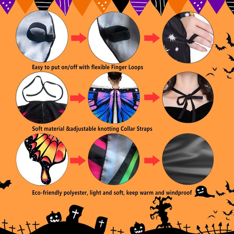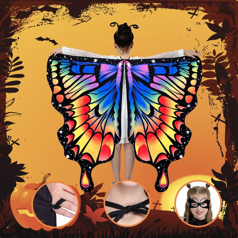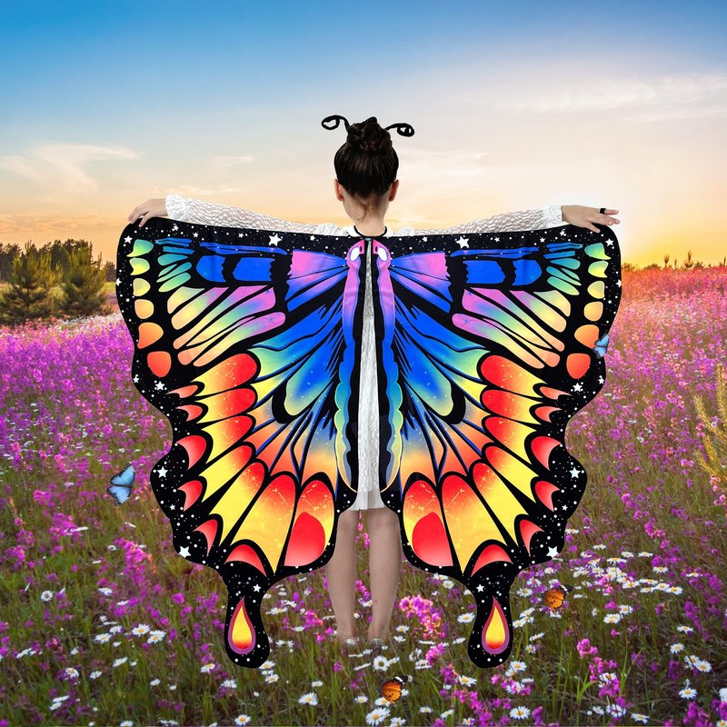 - MAGIC BUTTERFLY COSTUME FOR GIRLS - The girls butterfly wings shawl designed like a real butterfly. You can attach the butterfly cape tie ribbon at the neck, connect your finger with the flexible loop. Imagine that your lovely girl are a stunning butterfly or a fairy when the butterfly wings floats in the wind.