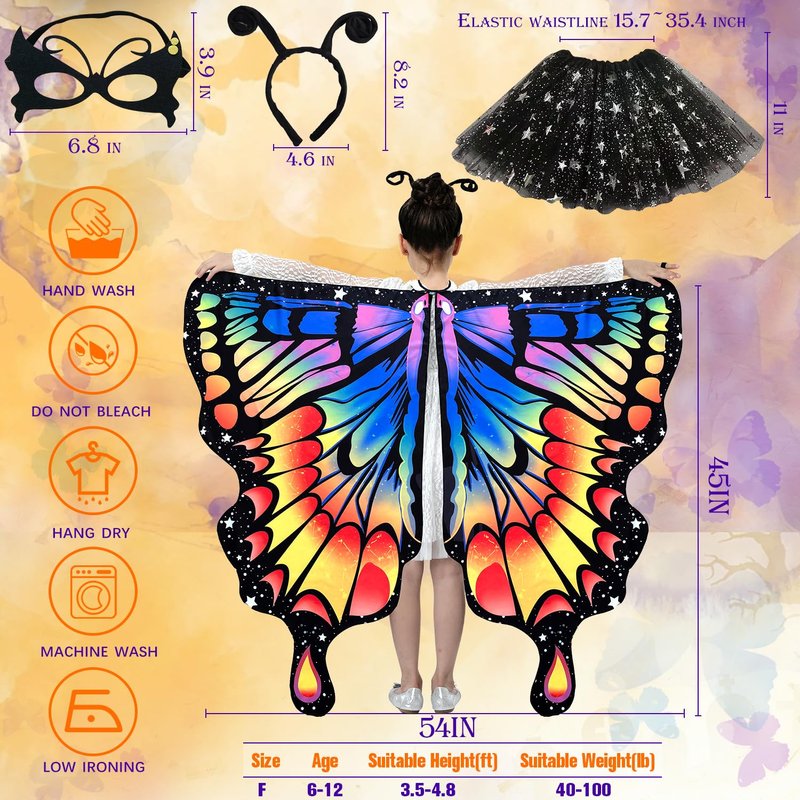 - HALLOWEEN PARTY DRESS FOR GIRLS AGES 6-12 - Girls butterfly costume measures 54 inch (width) x 44 inch (height) - Perfect for girls that 3' 5" -4' 5" tall. The lace eye-mask measures 12 inch (width) x 4.7 inch (height). The adjustable ribbon at the neck and the finger loops allow you to wear and take off the kids butterfly wing safely and easily. Besides, you can easily adjust the tightness of the lace mask and the antenna headband.