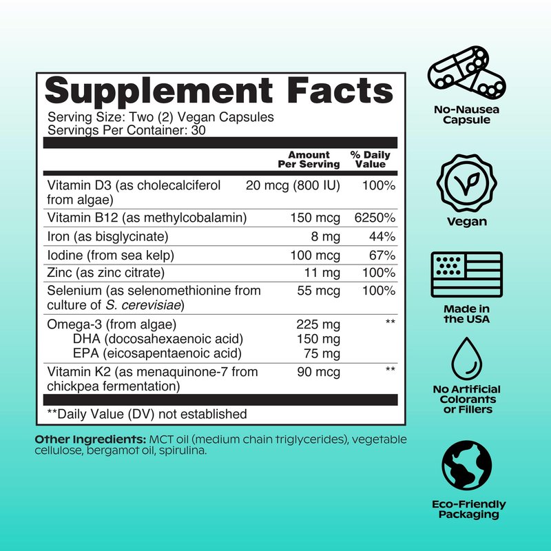 - 8 ESSENTIAL NUTRIENTS - The science-backed multivitamin formulated with the vegan vitamins, minerals and omega-3s to support a vegan, vegetarian or mostly plant-based diet including vegan omega-3 DHA + EPA, vitamin B12 (methylcobalamin), vitamin D3, selenium, iodine, vitamin K2, iron and zinc.