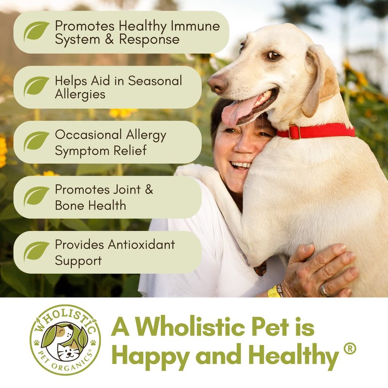 - Organic Ingredients: Made with only the finest, USA-sourced ingredients, this product is perfect natural allergy relief medication for dogs of all ages. Our vitamin C supplement for dogs helps support your dog's immune system and can help keep them feeling their best during those tough allergy months. Give your furry friend the relief they need with Wholistic Pet Organics!