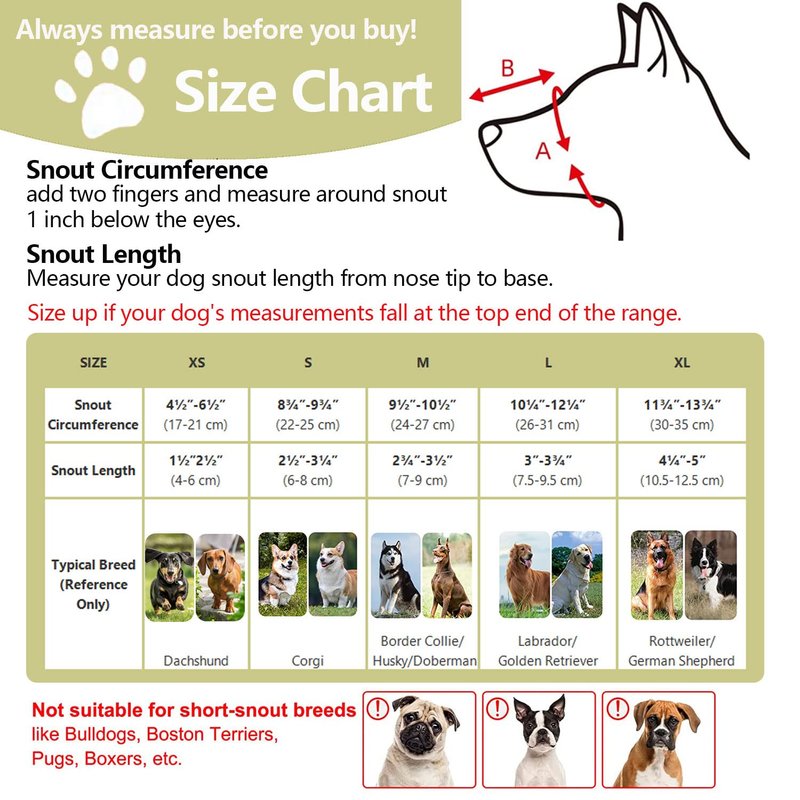 - MEAURE BEFORE BUYING: Add two fingers, then measure around top of snout about ½" below eyes. The extra space is vital for your pet's safety and comfort. The size chart is for reference only. For your pet's comfy, please measure before buying. 5 sizes available for Border Collie, Husky, Golden Retriever, German Shepherd and so on. [NOT suitable for SHORT snout dogs such as Pitbull and Boxer.