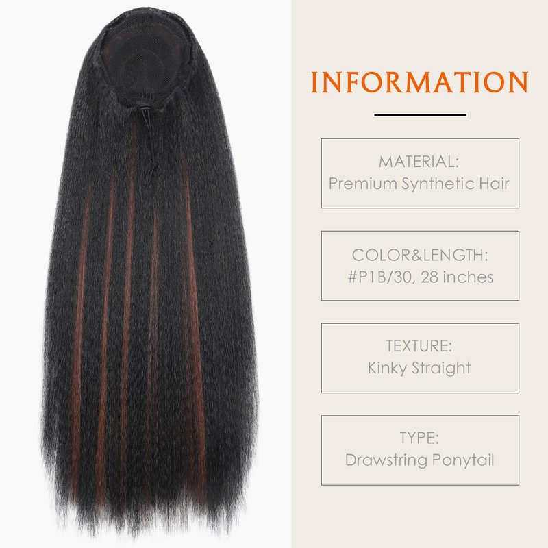 WIGNEE 28 Inches Kinky Straight Ponytail Extension Synthetic Drawstring Ponytail For Black Women Yaki Pony Tails Hair Extensions (28 Inches, 1B/30 Highlights)