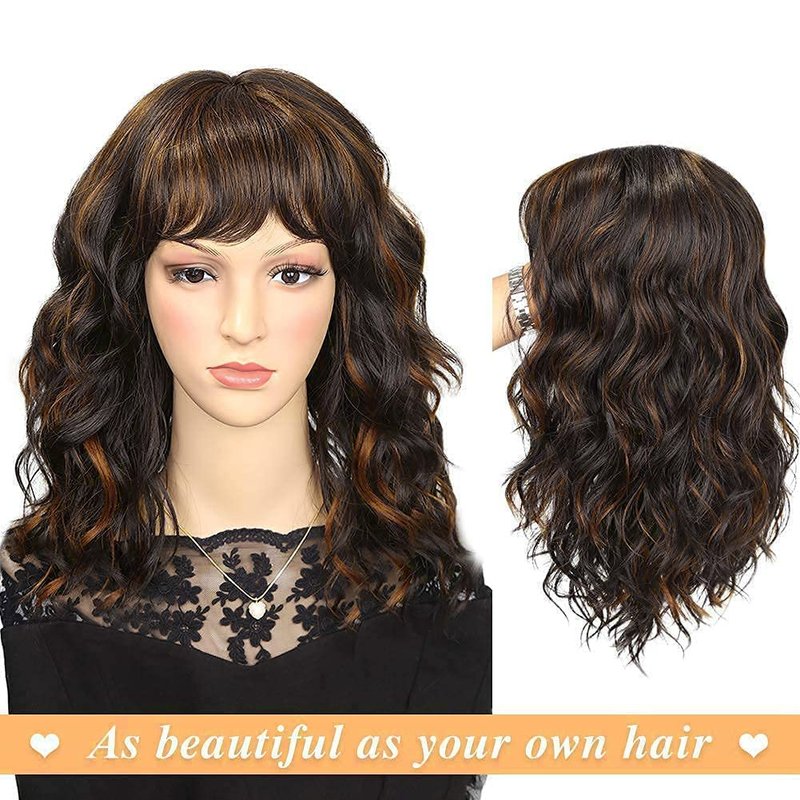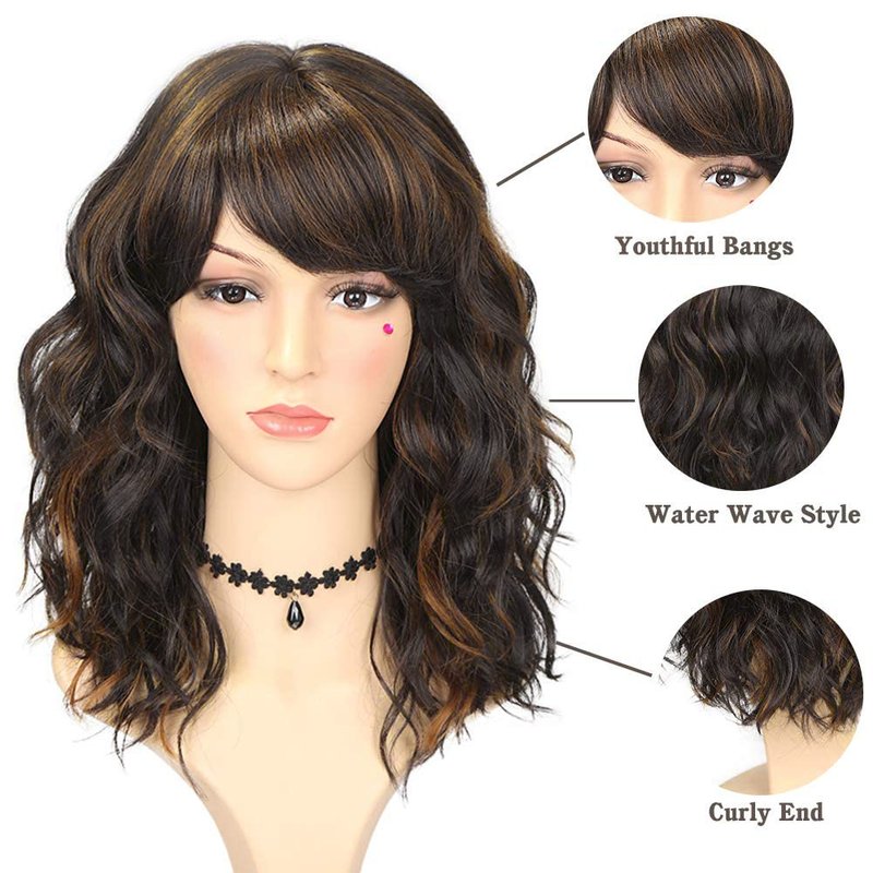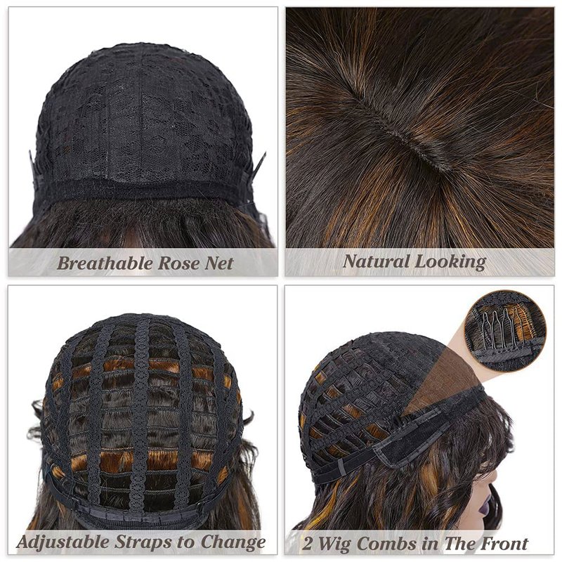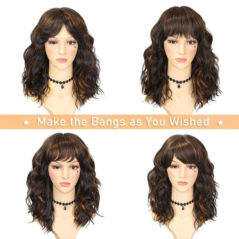 WIGNEE Natural Wave Wigs with Bangs Ombre Brown Curly Bob Wig for Black Women Mixed Brown Hightlights Wig for Women Shoulder Length Wavy Synthetic Wigs(14 Inch)