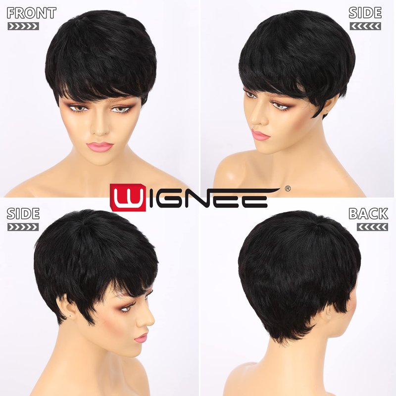 WIGNEE Short Natural Black Pixie Cut Human Hair Wigs With Bangs