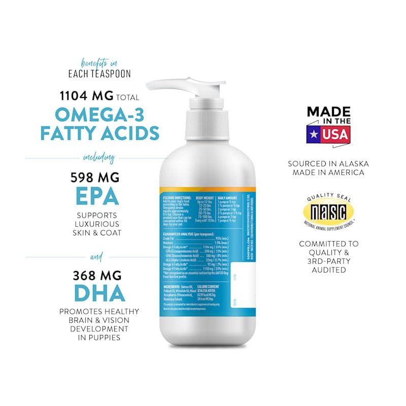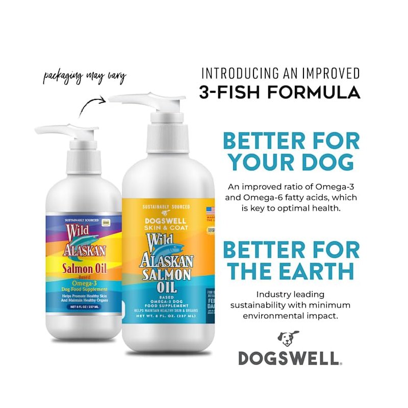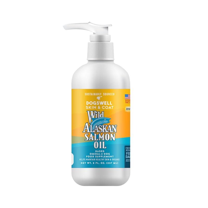 Wild Alaskan Salmon OilWild Alaskan Salmon Oil dog food supplement is brought to you from the wild salmon of the cold, deep, fresh Alaskan waters. Relieves dry and itchy skin and boosts a healthy immune system while fostering a bright and lustrous coat. Heart smart and easy to use this product contains only pure natural salmon oil and rosemary extract producing a rich taste dogs love.